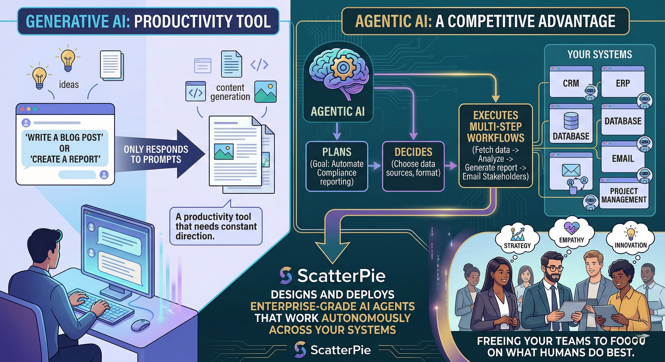 The artificial intelligence landscape is shifting from passive assistance to proactive agency — defined by goal-oriented models, tool-use proficiency, and the ability to navigate open-ended business challenges independently. The pioneers and tech-forward enterprises that will dominate this era are those building the robust data guardrails and feedback loops necessary for reliable machine autonomy. ScatterPie is their orchestration partner.